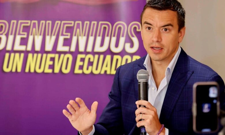 Frente a la prensa internacional en un hotel de Guayaquil, el empresario de 35 años que compite por la presidencia de Ecuador expuso sus prioridades y la orientación de su campaña de cara al balotaje de octubre, en el que enfrentará a la candidata del correísmo Luisa González, quien ganó la primera vuelta.