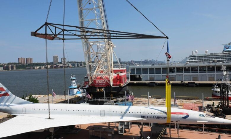 Este miércoles, una grúa levantó el Concorde de Intrepid en una barcaza para un pasaje muy subsónico al Navy Yard de Brooklyn, donde será desmantelado, lijado y repintado.