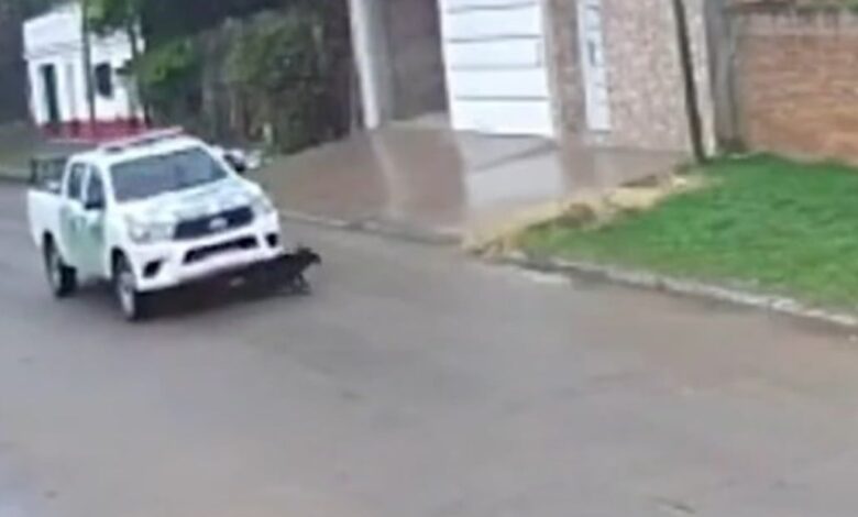 En las imágenes puede verse cómo un patrullero reduce su velocidad al advertir que un perro negro de gran porte, llamado Lobo, caminaba por medio de la calle. El vehículo frena hasta casi detenerse, pero inexplicablemente vuelve a tomar velocidad y pasa por encima del animal. A pesar de eso, el conductor sigue como si nada hubiese sucedido.