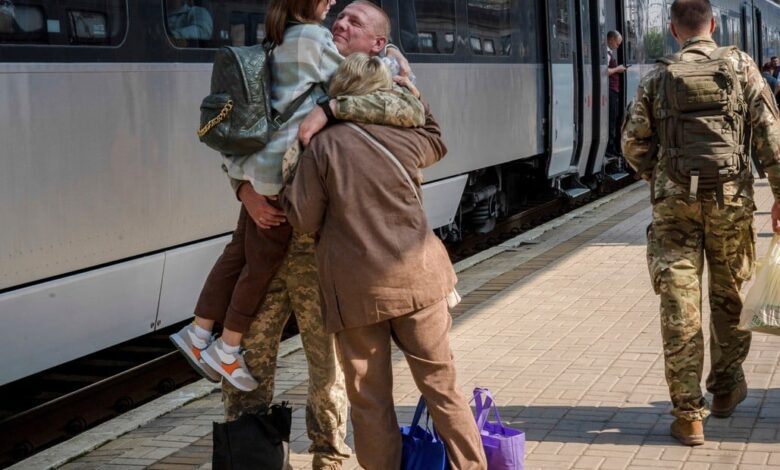 Algunos, que llevan mochilas de color militar colgadas sobre sus hombros, avanzan rápidamente, mientras que otros permanecen en la plataforma en abrazos largamente esperados.