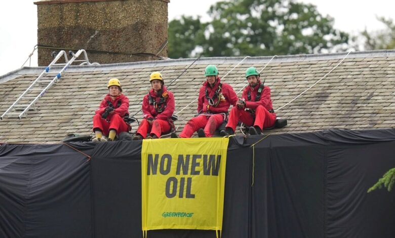 Los manifestantes de Greenpeace publicaron una foto de cuatro activistas en la parte superior de la mansión, catalogada de grado II y con un valor de 2 millones de libras esterlinas, en North Yorkshire el jueves. Desplegaron una tela negra de 200 m2 para cubrir su fachada, como si fuera un ataúd.